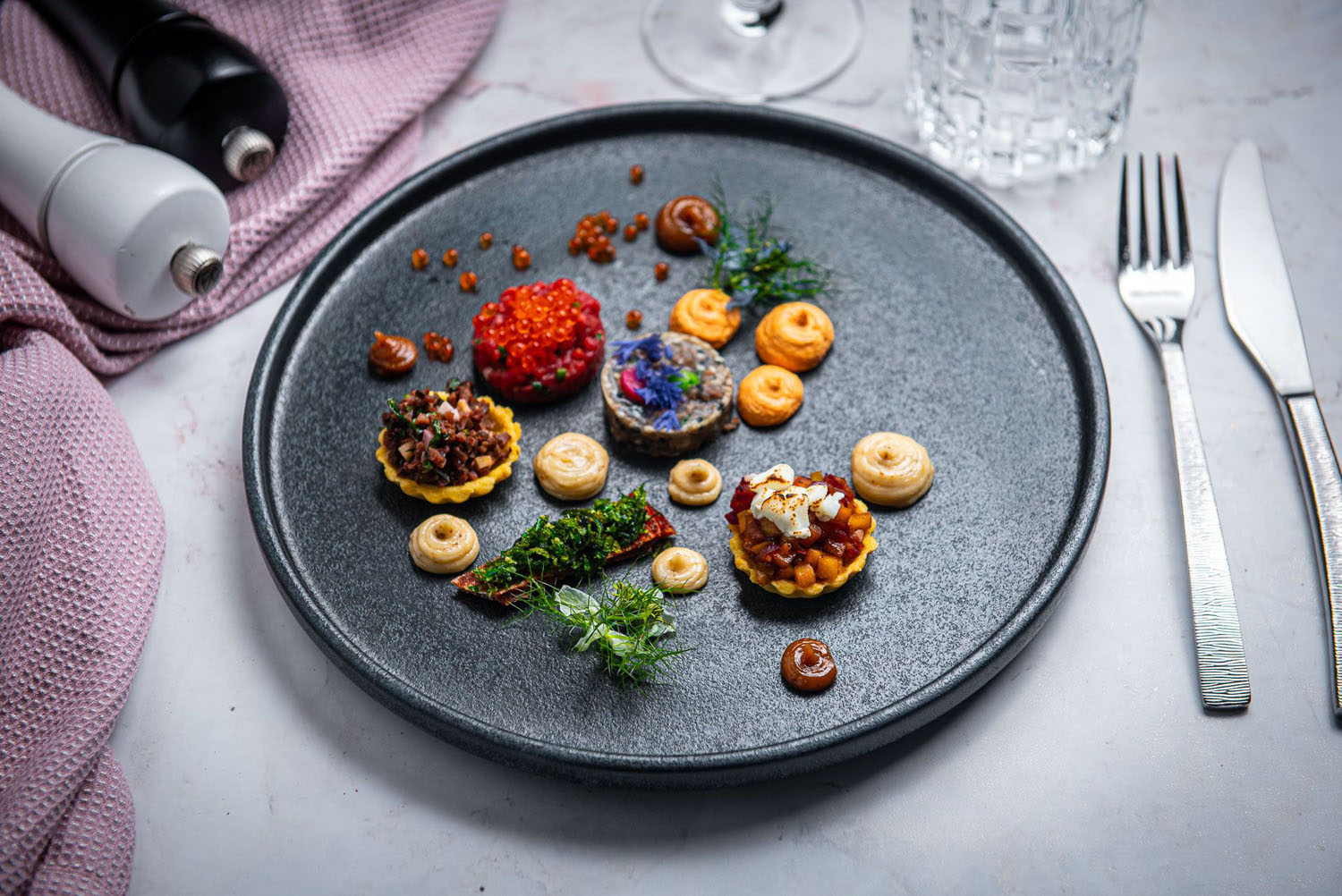 Ankanlihahyytelö / naudanhakkelus / vuohenjuusto-omenachutney / leppärouskuhöystö / ilmakuivattu tonnikala ja wakame / valkosipulivaahto / sitruuna ja-paprikavaahto / tattimajoneesi